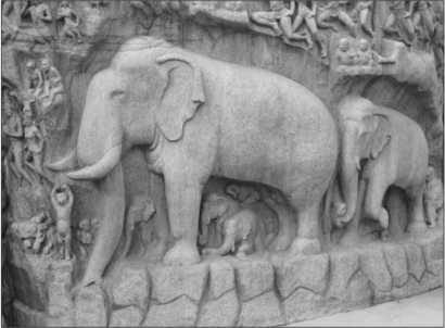 بخشی از نقش‌برجستۀ مشهور به «توبۀ ارجونا» در معبد ماهابالی پورام در جنوب هند که گربه زاهد را در وضعیت یوگایی نشان می‌دهد.